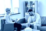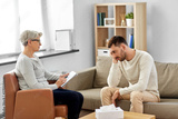 psychology, mental therapy and problem concept - senior woman psychologist taking notes to notebook and sad young man patient at psychotherapy session