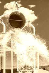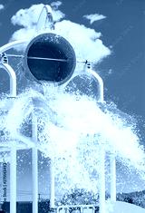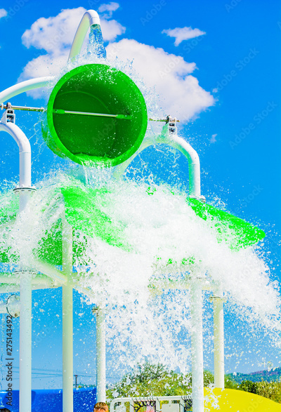 Detail of the children's water playground attraction, waterpark - the green bucket of water at the moment of pouring.