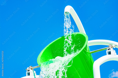 Detail of the children's water playground attraction, waterpark - the green bucket of water at the moment of pouring.