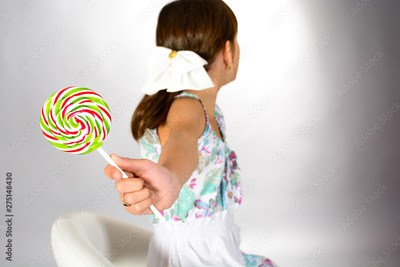 child - girl refusing sweet lollipop. No sweets! I love my teeth! focus on rainbow lollipop