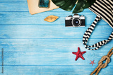 Accessories for travel top view on blue wooden background with copy space. Adventure and wanderlust concept image with travel accessories. Preparing for an exotic trip, journey and sightseeing.