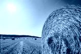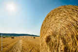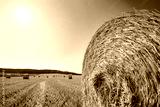 big roll harvested straw on the mown field with great perspective and other roles, background consists of pure blue sky and sun in the frame