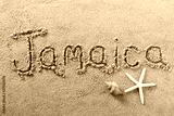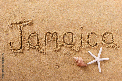 Jamaica word written in sand on a sunny summer beach with starfish holiday vacation travel destination sign writing message photo
