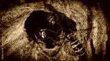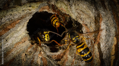 detail entrance poking a hornet's nest with aggressive wasp, focus on mandibles wasp