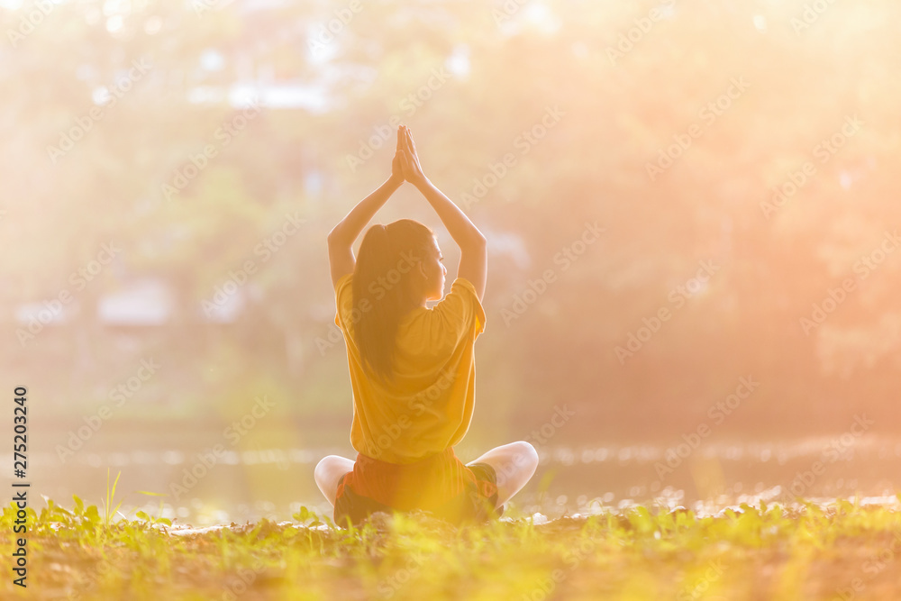 Asian woman practicing yoga warrior pose