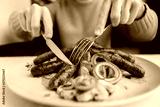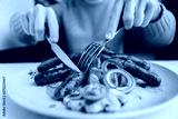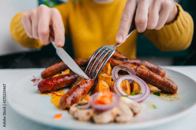 Close up of man eating sausages