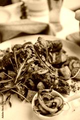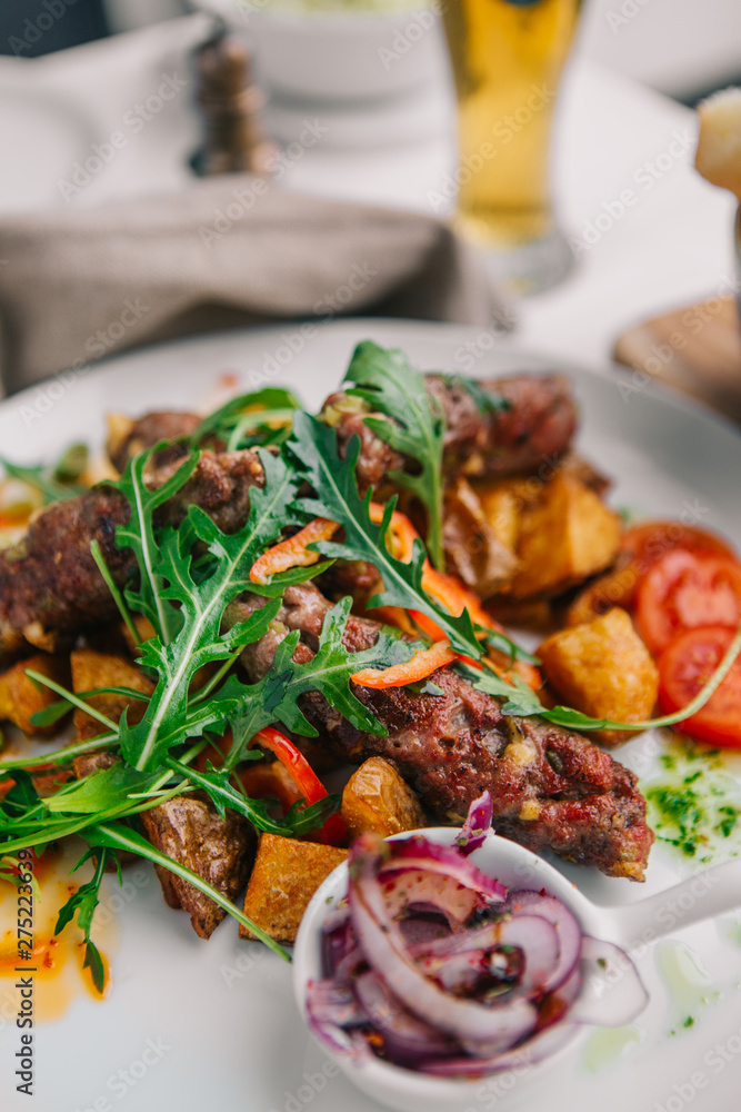Close up of meal. Meat with potato and salad. Cevapi