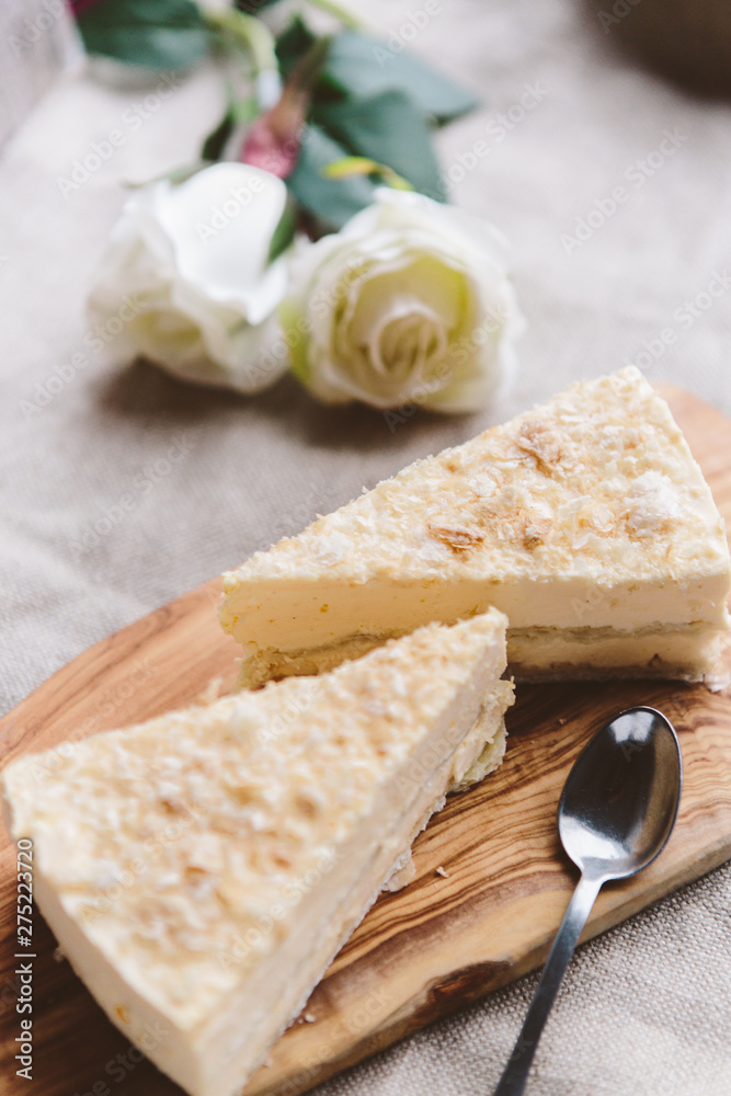 Balkan cremeschnitte or krempita pie. Sweet cream pie slices on a plate