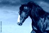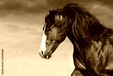 Bay horse portrait with long mane in motion. Black and white