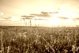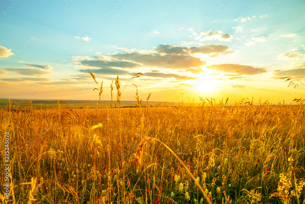 Saratov region, travel, landscape and nature of Russia. Yellow golden orange dramatic dawn at dawn over endless fields, hills, meadows. The sun rises on a warm summer morning above the horizon