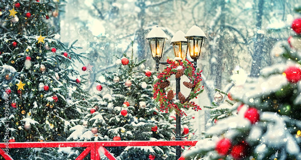 New Year and Christmas holiday background. beautiful street lantern with Christmas wreath, decorated Christmas trees in colorful balls outdoor. winter festive seasonal decorations on street