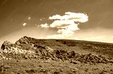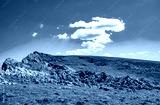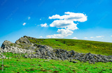 Landscape of green grass and rock hill in spring with beautiful blue sky and white clouds. Countryside or rural view. Nature background in sunny day. Fresh air environment. Stone on the mountain.