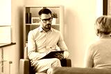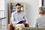 geriatric psychology, mental therapy and old age concept - senior woman patient and psychologist with clipboard taking notes at psychotherapy session