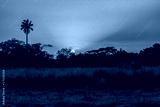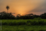Perfect colorful African sunset with backlit silhouette of palm trees. Guinea, West Africa.