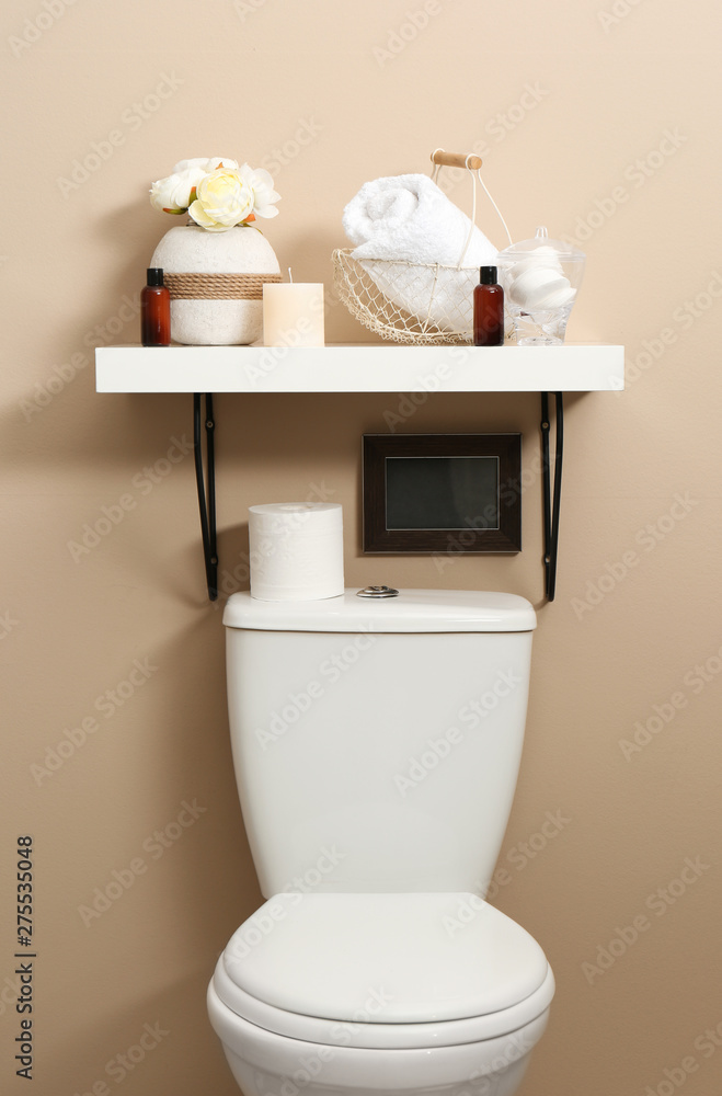 Shelf with different stuff on beige wall above toilet bowl in restroom interior