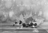 beautiful autumn composition. autumn leaves and cones on wooden table outdoor, sunny natural background. fall season. copy space. template for design