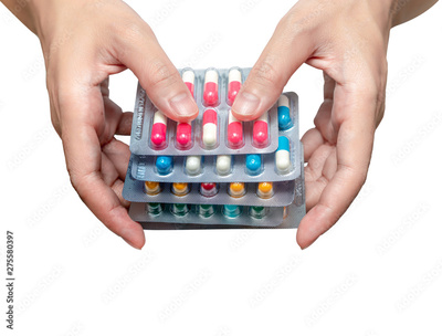 Woman hand holding pack of antibiotic capsule pills isolated on white background. Give or receive drug. Antibiotic drug overuse. Antimicrobial drug resistance. Pharmaceutical product. Healthcare.