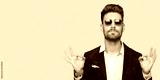 Young handsome elegant man wearing sunglasses and fashion blazer relax and smiling with eyes closed doing meditation gesture with fingers. Yoga concept.