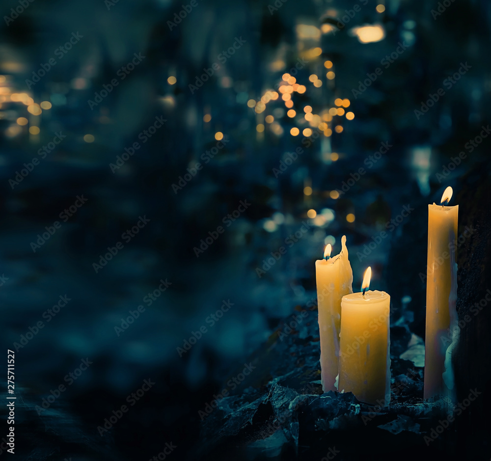 magic candles in forest, fabulous composition. beautiful mysterious fairy abstract scene. mystical landscape with Night forest and candles. Dark magic, witch ritual, Halloween background. copy space