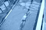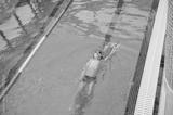top view of a 7-year boy swimming backstroke in a swimming pool