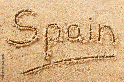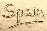 Spain word written in sand on a sunny spanish summer beach holiday vacation travel destination sign writing message photo