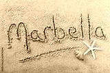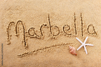 Marbella spain costa del sol word written in sand on a sunny spanish summer beach with starfish holiday vacation travel destination sign writing message photo