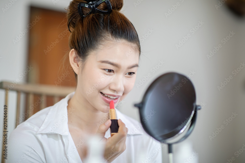 Portrait of a Beauty young woman brunette cosmetics looking in the mirror using red lipstick for beauty lips,feeling so fresh and happiness,Beauty and Cosmetic