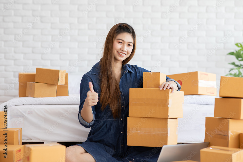 SME entrepreneur of Young Asian women working with laptop for Online shopping at home,Cheerful and Happy with box for packaging in home,Own Business Start up for Business Online and Online shopping