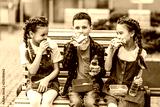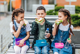 Kids eating outdoors the school from plastick lunch boxe. Healthy school breakfast for child. Sandwich time.