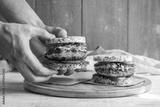 man hands holding healthy burger with round rice crisp bread carrot cutlet tomato lettuce coleslaw salad copy space