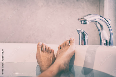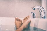 Woman taking a bath at home cozy lifestyle - spa therapy bath salts wellness body care relax girl with feet crossed in happiness.