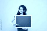big sales. child on yellow backdrop. back to school. Interesting info. happy girl in french beret. small girl kid with school backboard, copy space. information board. Fashion news. place for writing