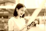 Asian women of happy smiling are listening to music from white headphones. And using hands touch to use various functions, happy mood.