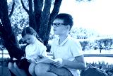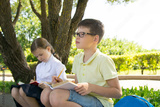 students doing homework, in the park in the fresh air, a boy with glasses, thought about the task