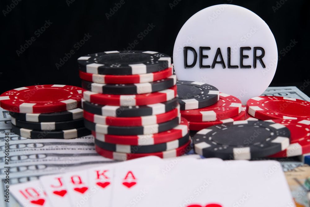 On dollars there are chips for playing in a casino, a set of cards, a straight and a dealer sign