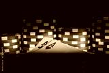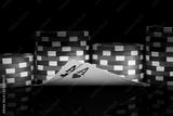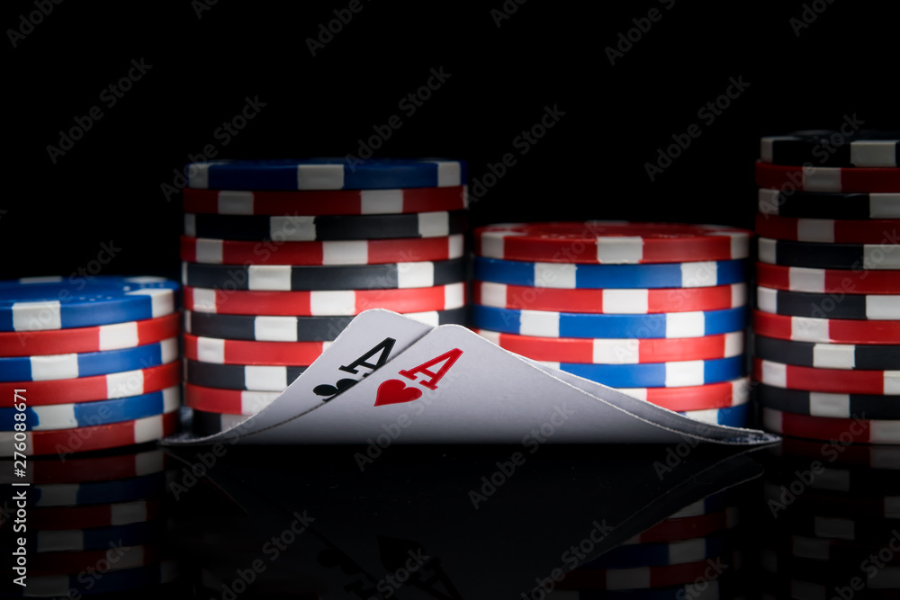 on a black background, with a reflection, pyramids of chips, for playing poker, lined up, close-up, on the two highest cards