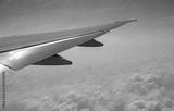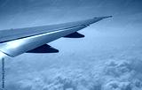 Wing of plane over white clouds. Airplane flying on blue sky. Scenic view from airplane window. Commercial airline flight. Plane wing above clouds. Flight mechanics concept. International flight.