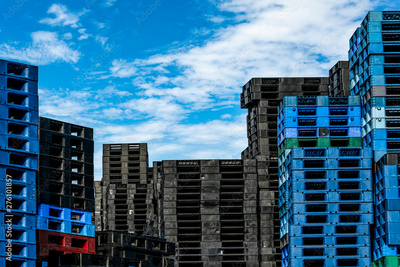 Plastic shipping pallet for sale and for rent business. Industry plastic pallet stacked at factory warehouse. Cargo and shipping business concept. Pile of plastic pallet for distribution and delivery.