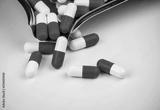Red-white capsule pills on stainless steel drug tray and some on white table. Pharmacy drugstore background. Pharmaceutics concept. Pharmaceutical industry. Medicine in hospital. Global drug market.