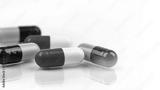 Colorful antibiotics capsule pills on white background. Antibiotic drug resistance. Pharmaceutical industry. Pharmacy products. Drugstore background. Medicine for treatment infection. Health care.