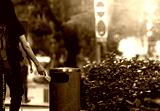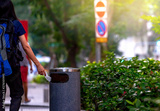 Woman hand throwing twisted empty water bottle in recycle bin. Gray plastic recycle bin. Backpacker discard bottle in trash bin. Waste management. Plastic bottle garbage. Reduce and reuse plastic.