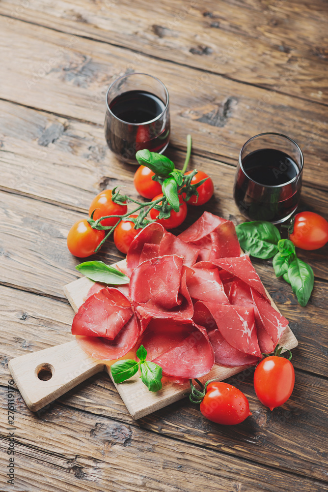 Italian antipasto with bresaola and red wine