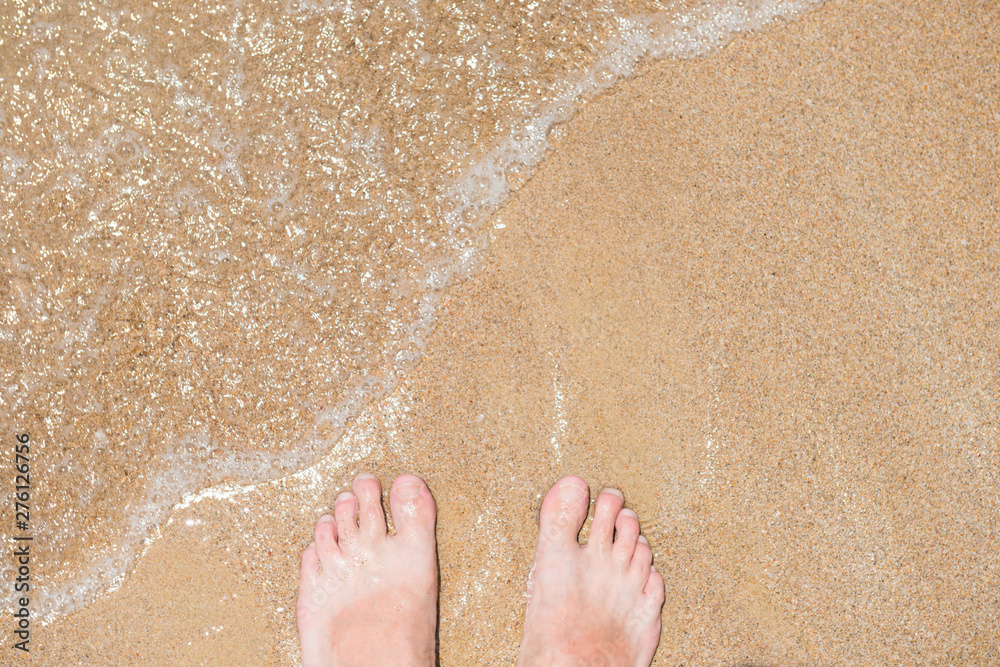 Closeup view of bare human feet on sand beach background. Summer vacation concept