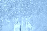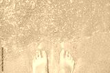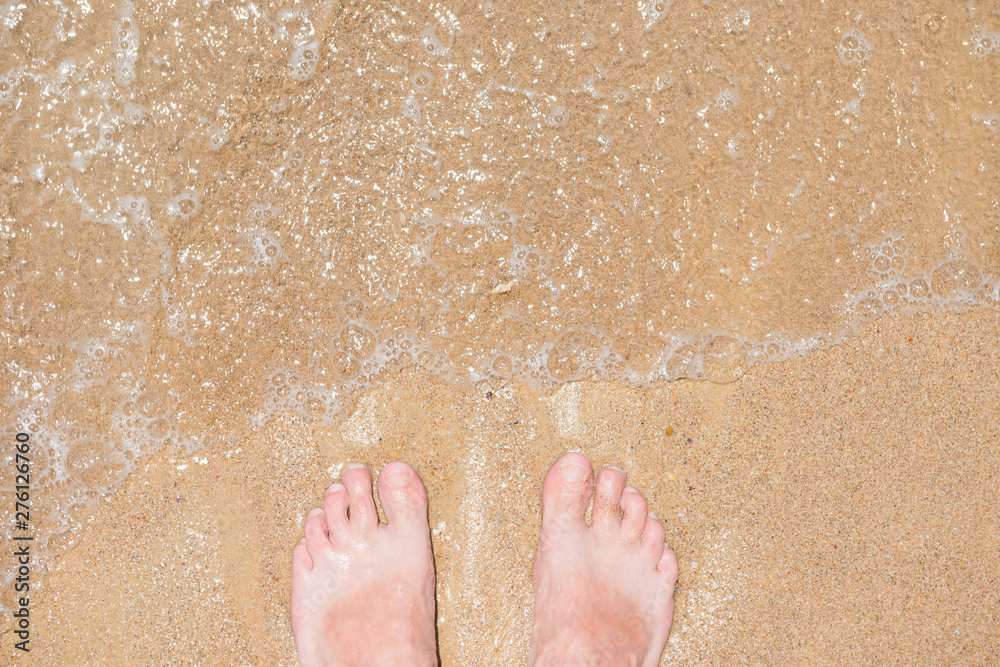 Closeup view of bare human feet on sand beach background. Summer vacation concept