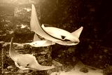 Group of stingrays are swimming on the blue sea near the underwater rocks.