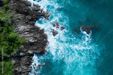 Aerial drone top view of ocean's beautiful waves crashing on the rocky island coast