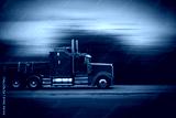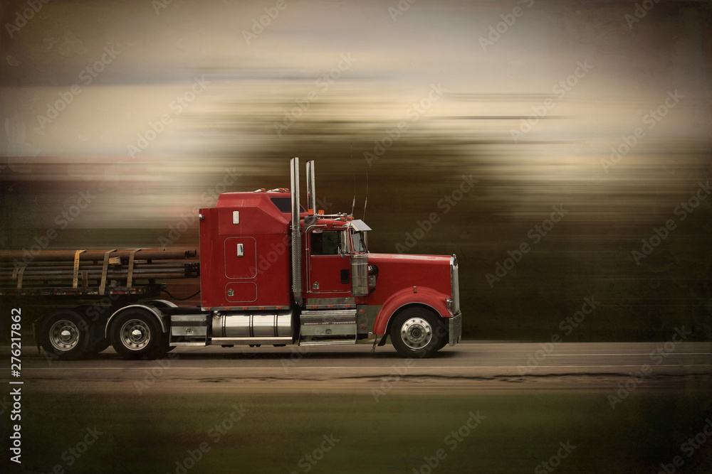 Bright red modern big rig semi truck and trailer in motion on a highway