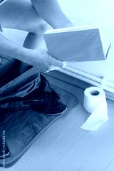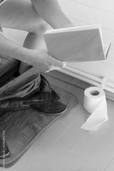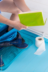 a man sits on a push in a toilet with pain in his stomach and reads a book