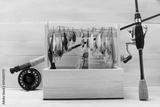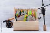 set for fishing in a box on a gray table