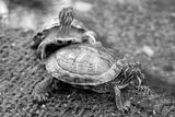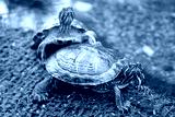 Freshwater turtles on the shore near the water.